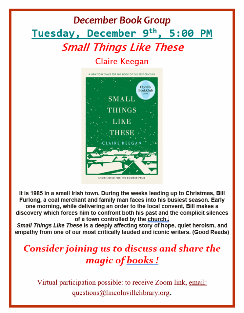 Even if you haven’t read the book, you are invited to hear about it at the monthly book discussion. It’s always enlightening and enjoyable.