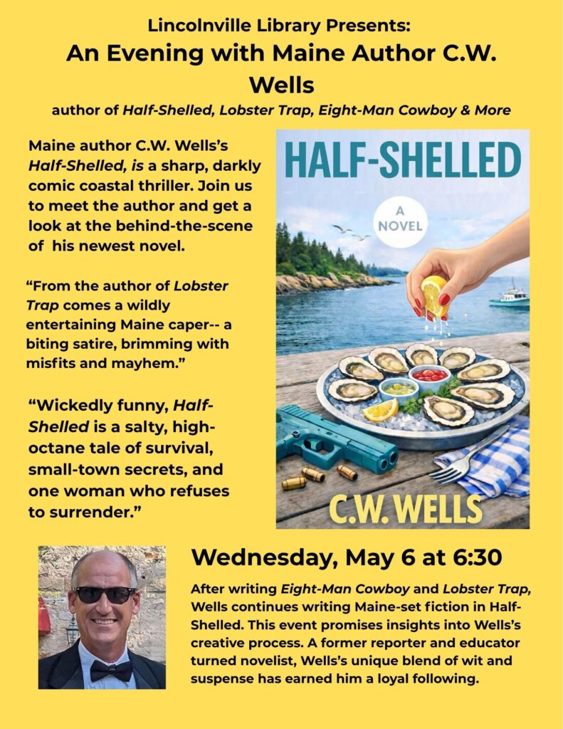 Maine author, C. W. Wells’s Half-Shelled will be the feature of the evening. Join us to meet the author and get a first-hand behind-scenes-look at his most recent novel. This is sure to be an interesting and fun evening.