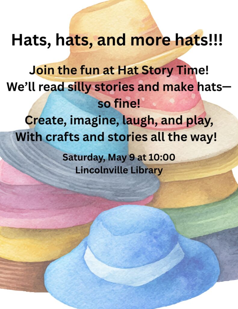 Wear your favorite hat to our Hats storytime. Hear about Hats for Sale, a Blue Hat, a Green Hat and Old hat, New Hat. Hear about Magic Hats and Jennies Hat and A Cat in the Cat.